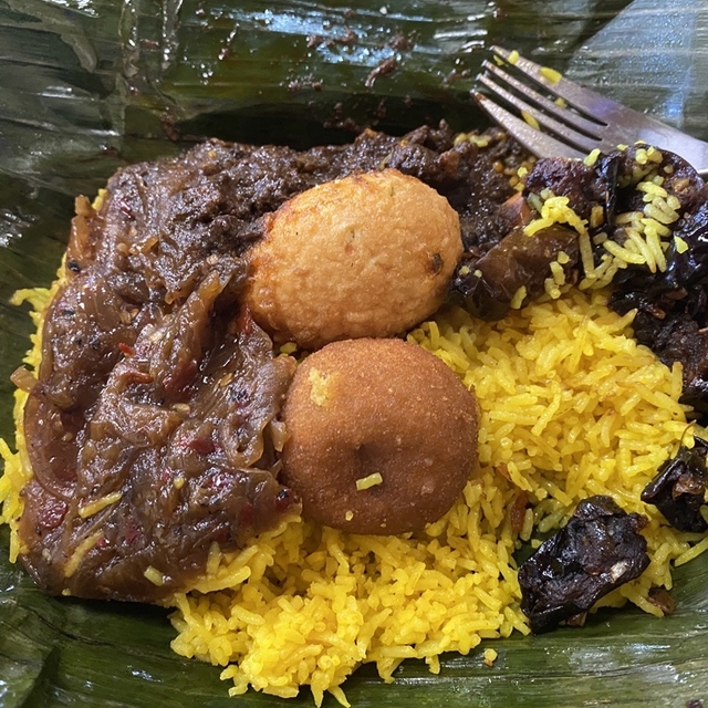 で、こちらではバナナの皮…じゃなくてバナナの葉っぱで包んだスリランカ式のお弁当「ランフライス(ランプライス)」が食べられるとのこと!
